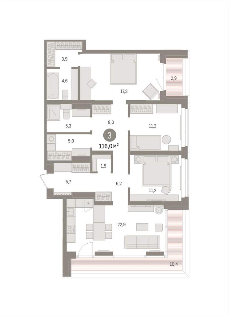 | Квартира с кухней-гостиной и тремя спальнями в кварталах «На Минской». Особенности планировки: гардеробная, панорамное остекление, лоджия, предчистовая отделка, мастер-спальня, постирочная.