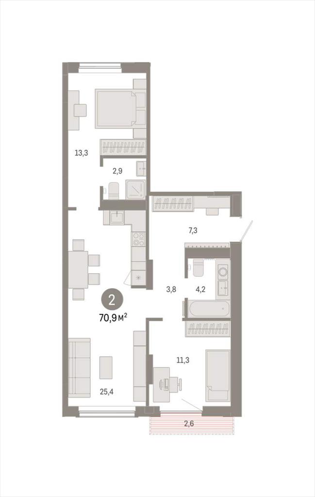 | Квартира с кухней-гостиной и двумя спальнями в Октябрьском на Туре. Особенности планировки: вид во двор, разнесённые спальни, предчистовая отделка, мастер-спальня, балкон.