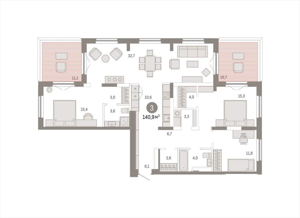 | Квартира с кухней-гостиной и тремя спальнями в Октябрьском на Туре. Особенности планировки: вид на реку, свободная планировка, разнесённые спальни, мастер-спальня, терраса, постирочная, терраса на крыше.