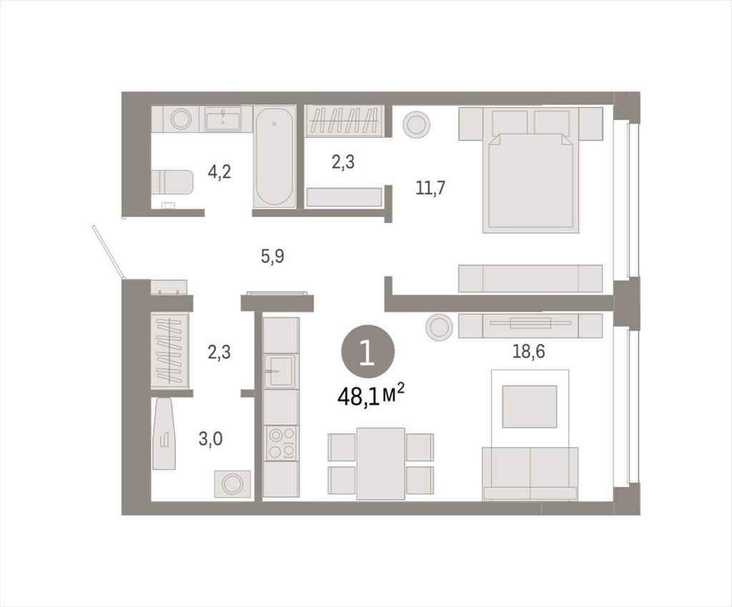 | Квартира с кухней-гостиной и одной спальней в жилом районе «Республики 205». Особенности планировки: гардеробная, ремонт в подарок, постирочная.