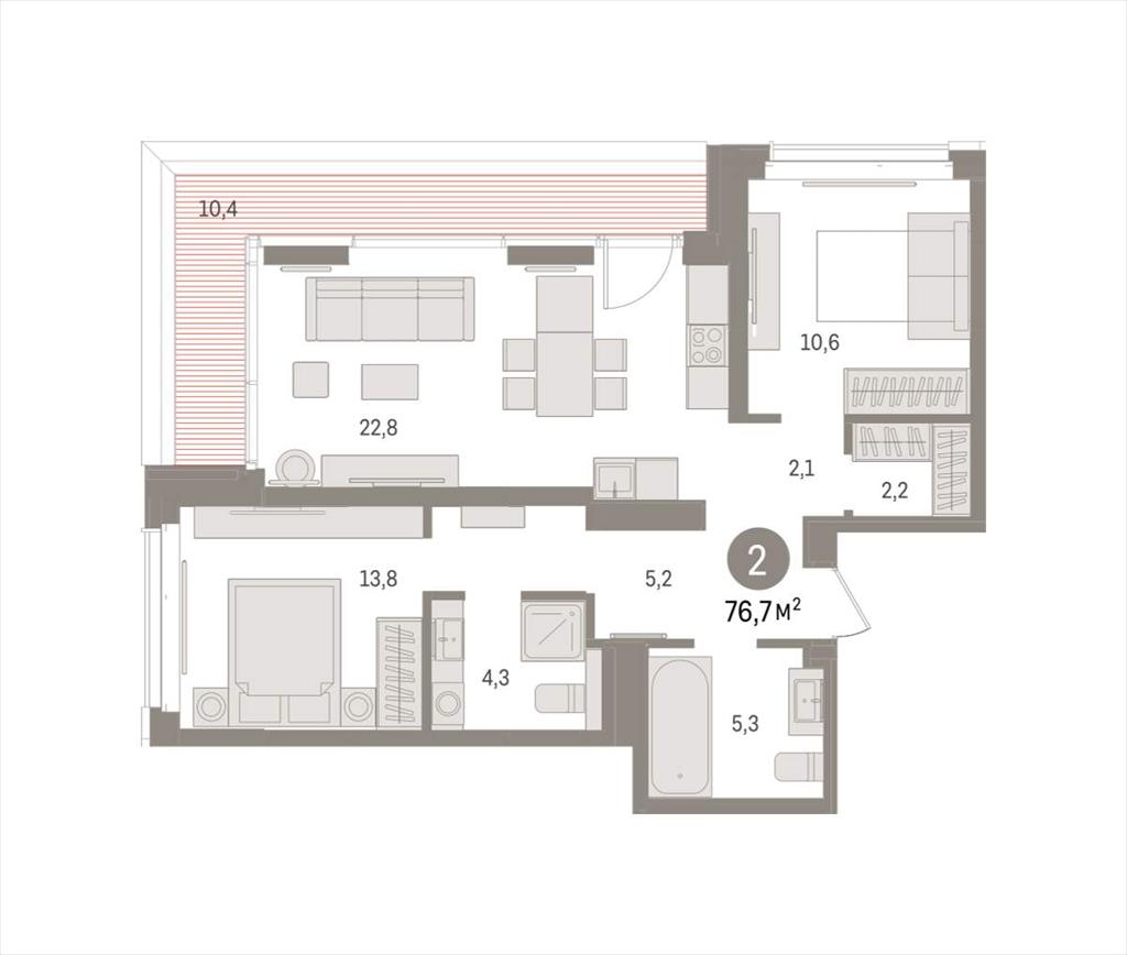 Квартира с кухней-гостиной и двумя спальнями в кварталах «На Минской». Особенности планировки: гардеробная, панорамное остекление, лоджия, разнесённые спальни, предчистовая отделка, мастер-спальня.