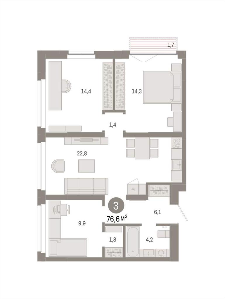 Квартира с кухней-гостиной и тремя спальнями в жилом районе «Республики 205». Особенности планировки: гардеробная, рабочий кабинет, разнесённые спальни, ремонт в подарок, балкон.