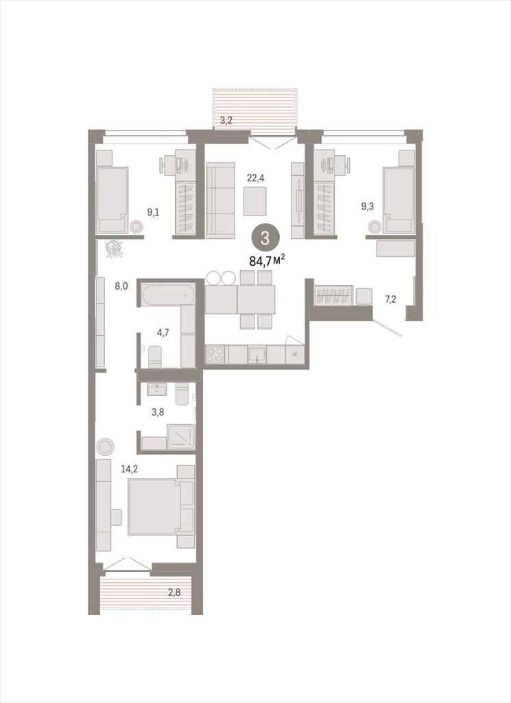 Квартира с кухней-гостиной и тремя спальнями в жилом районе «Республики 205». Особенности планировки: вид во двор, лоджия, разнесённые спальни, предчистовая отделка, мастер-спальня, балкон.