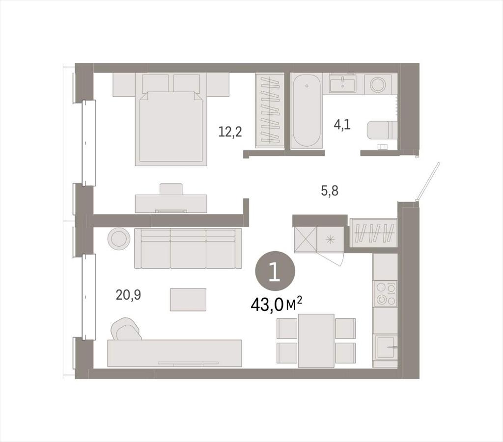 Квартира с кухней-гостиной и одной спальней в кварталах «На Минской». Особенности планировки: предчистовая отделка.