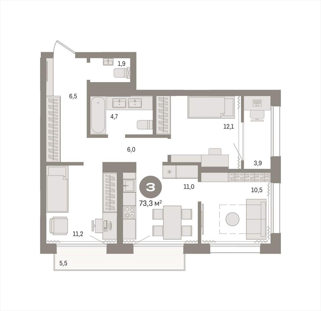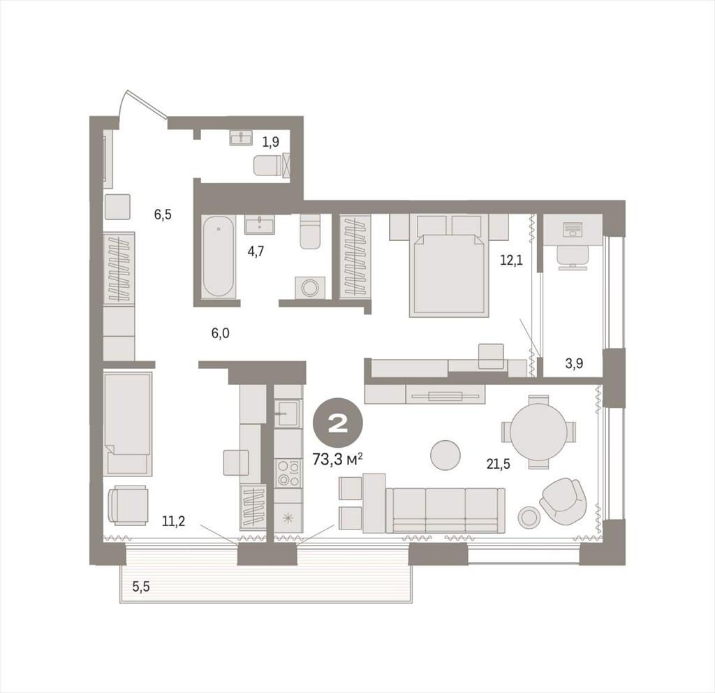 | Квартира с кухней-гостиной и двумя спальнями в Октябрьском на Туре. Особенности планировки: второй санузел, вид во двор, тёплая лоджия, предчистовая отделка, балкон.
