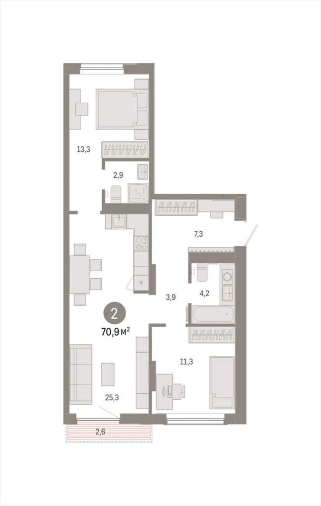 | Квартира с кухней-гостиной и двумя спальнями в Октябрьском на Туре. Особенности планировки: вид во двор, разнесённые спальни, предчистовая отделка, мастер-спальня, балкон.