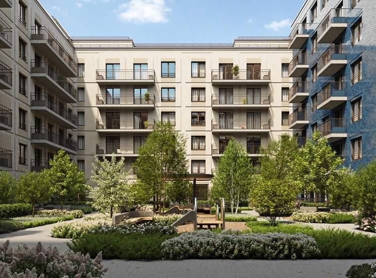 Дворы располагаются на стилобатах и имеют приватный характер с уклоном на тихий и спокойный отдых. Каждый из дворов отличается по функциональному наполнению и дизайну. Тут есть детские площадки, сенсорные сады, лаунж-зоны, функциональные газоны и зоны воркаута. Все оборудование выполнено из натурального дерева: оно вписывается в общий облик, не нагревается летом и не промерзает зимой.