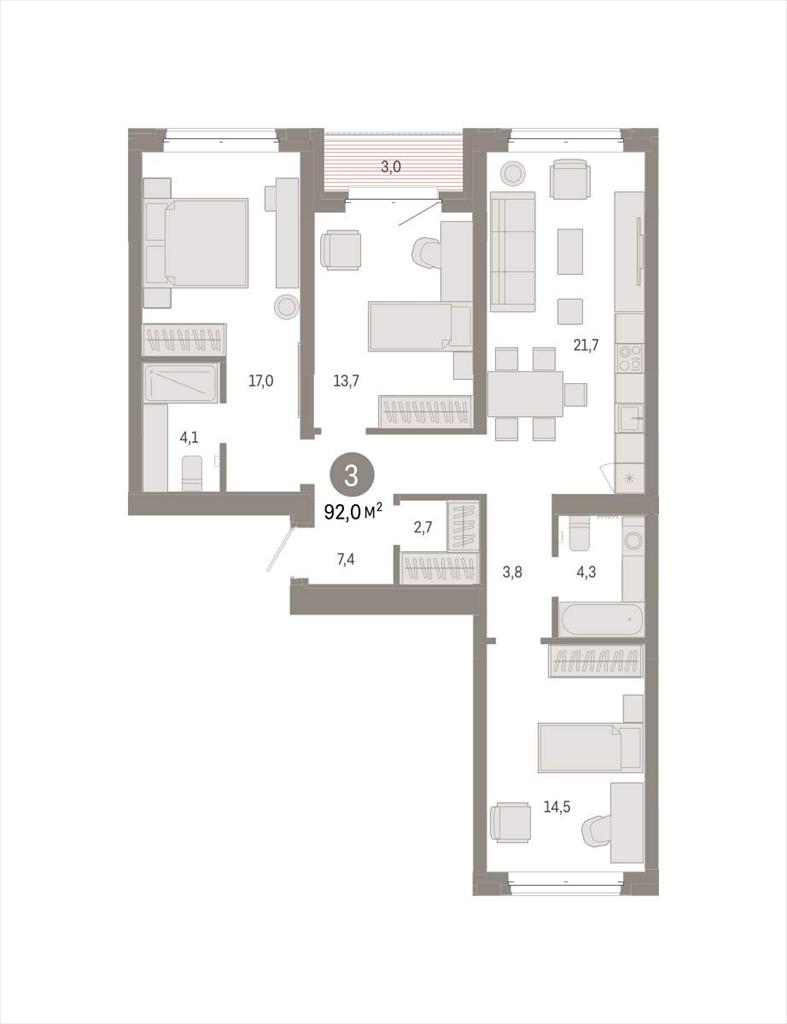 Квартира с кухней-гостиной и тремя спальнями в кварталах «На Минской». Особенности планировки: окна на две стороны, гардеробная, вид во двор, тёплая лоджия, разнесённые спальни, предчистовая отделка, мастер-спальня.