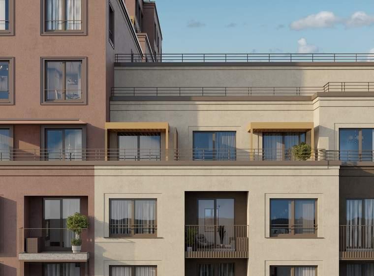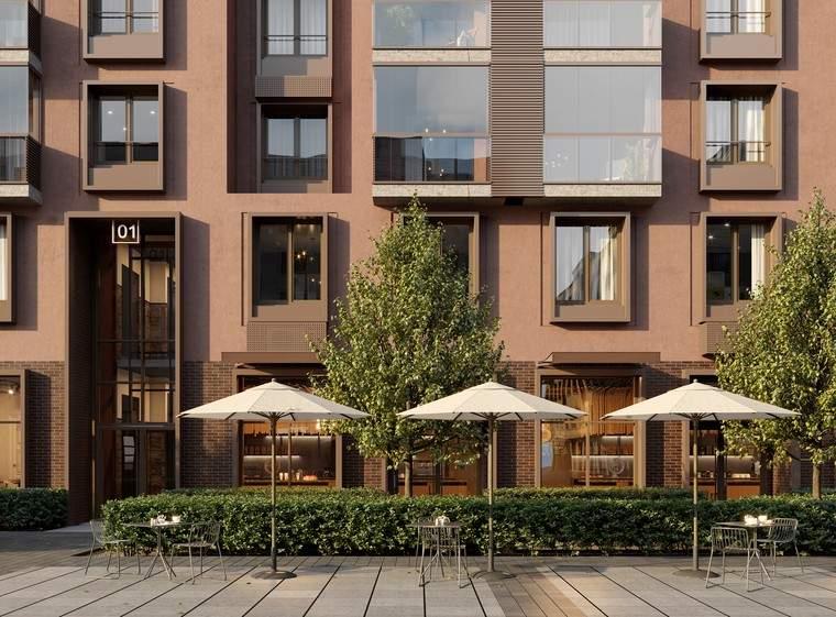 Проект находится в оживлённой части города, поэтому было важно создать приватность - двор поднят на уровень второго этажа и выдержан в стиле японского минимализма: здесь появятся пергола, опоры которой напоминают тории - п-образные ворота синтоистского храма. Под ней - лаунжи с мягкой уличной мебелью и миниатюрный пруд. Находясь в центре мегаполиса жители смогут почувствовать себя на природе.