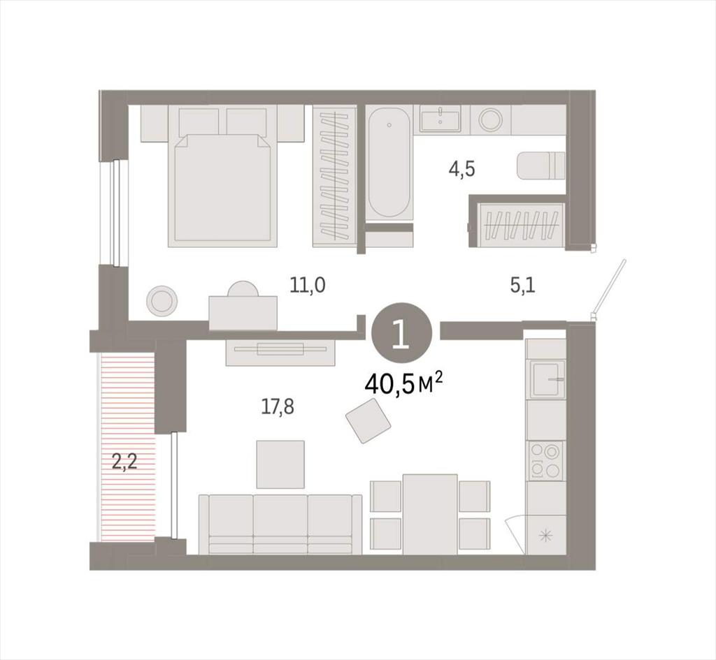 | Квартира с кухней-гостиной и одной спальней в жилом районе «Республики 205». Особенности планировки: тёплая лоджия, лоджия, предчистовая отделка.