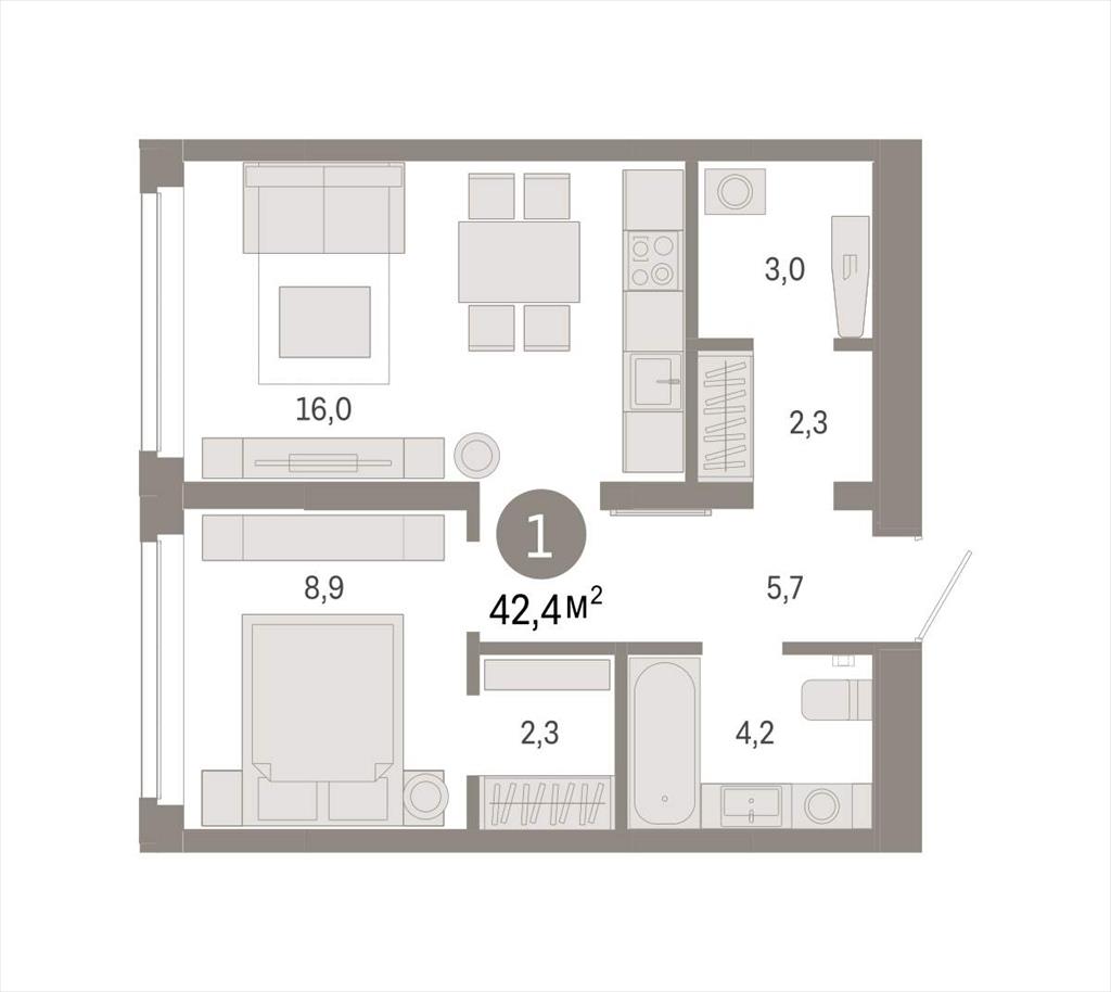 общая 42,43 м2, жилая 8,91 м2, кухни 15,96 м2 |
