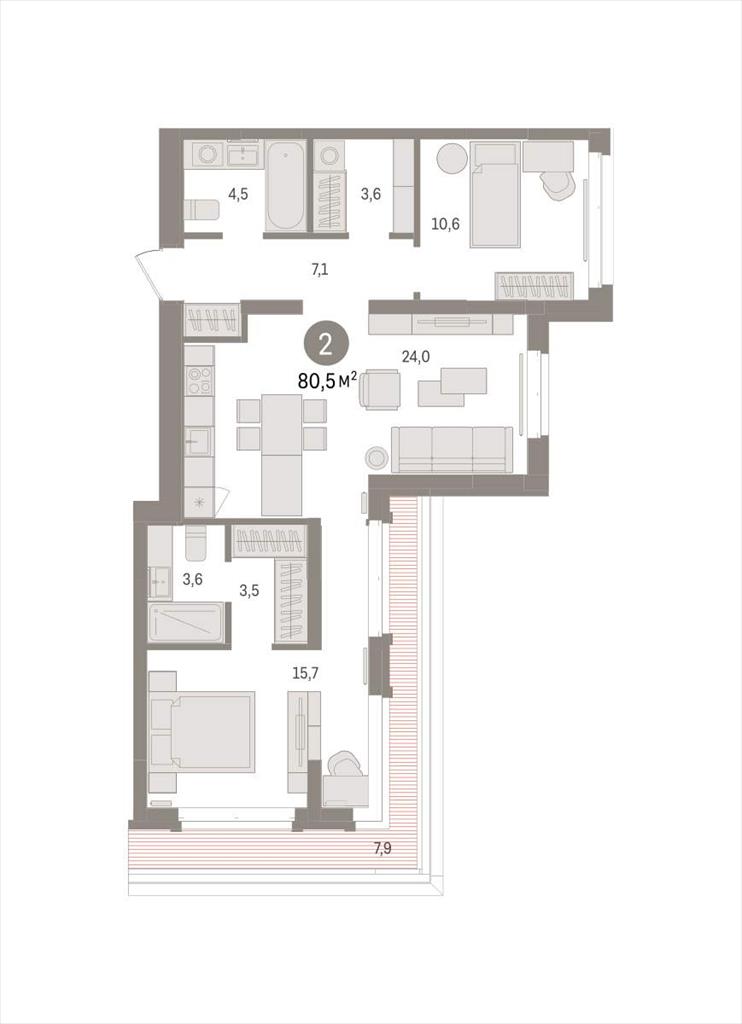 Квартира с кухней-гостиной и двумя спальнями в кварталах «На Минской». Особенности планировки: гардеробная, разнесённые спальни, предчистовая отделка, мастер-спальня, постирочная, балкон.