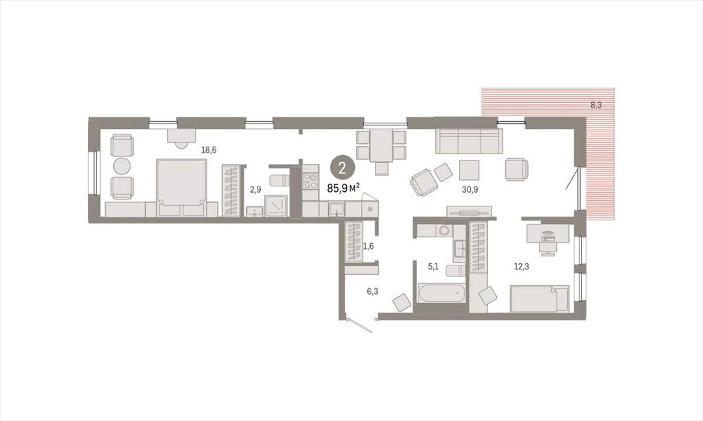 | Квартира с кухней-гостиной и двумя спальнями в жилом районе «Республики 205». Особенности планировки: гардеробная, вид во двор, разнесённые спальни, предчистовая отделка, мастер-спальня, балкон.