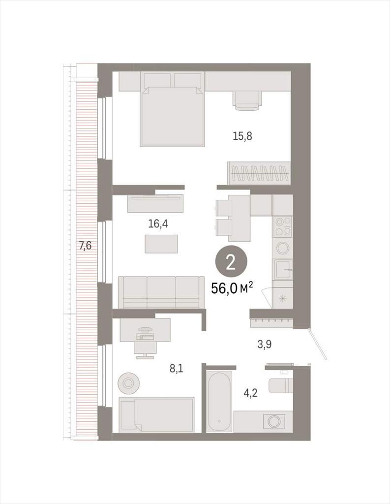 | Квартира с кухней-гостиной и двумя спальнями в Октябрьском на Туре. Особенности планировки: разнесённые спальни, предчистовая отделка, терраса на крыше.