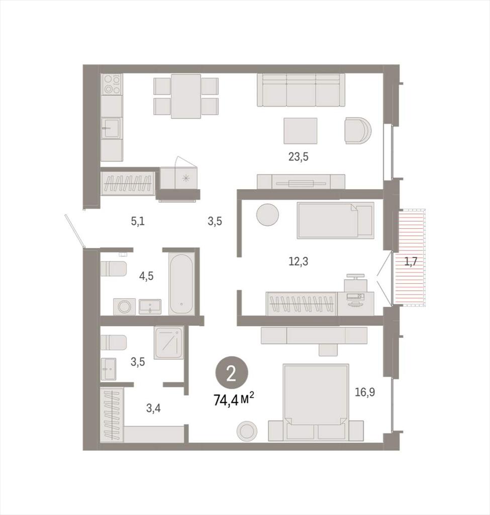 | Квартира с кухней-гостиной и двумя спальнями в жилом районе «Республики 205». Особенности планировки: гардеробная, предчистовая отделка, мастер-спальня, балкон.