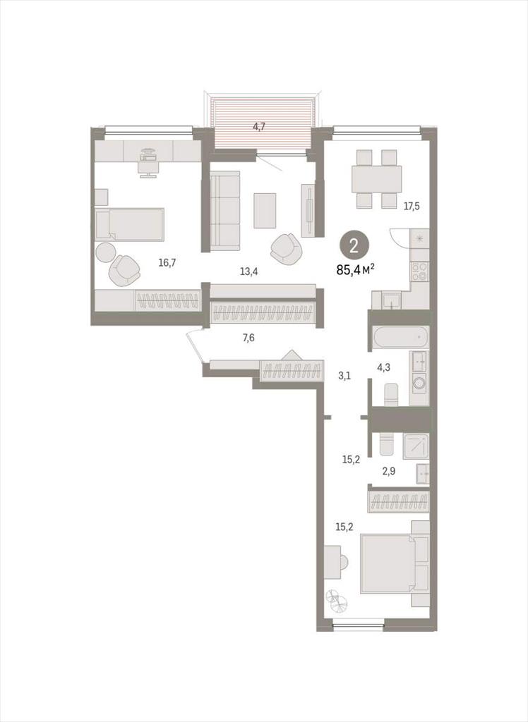 Квартира с кухней-гостиной и двумя спальнями в жилом районе «Зарека». Особенности планировки: вид во двор, разнесённые спальни, предчистовая отделка, мастер-спальня, балкон.