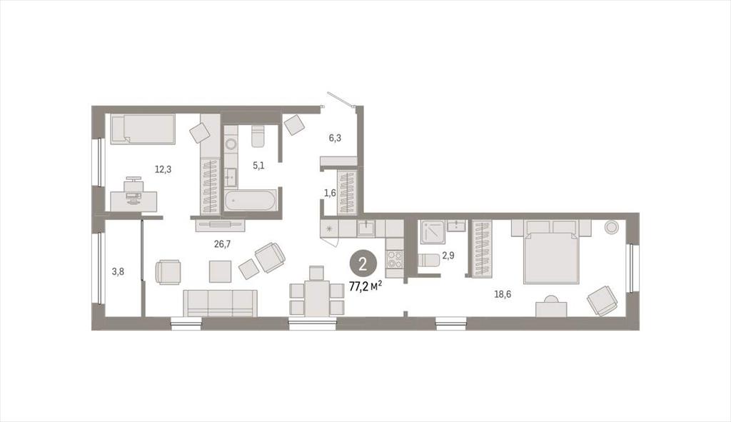 | Квартира с кухней-гостиной и двумя спальнями в жилом районе «Республики 205». Особенности планировки: обмен по рыночной цене, гардеробная, вид во двор, тёплая лоджия, разнесённые спальни, предчистовая отделка, мастер-спальня.