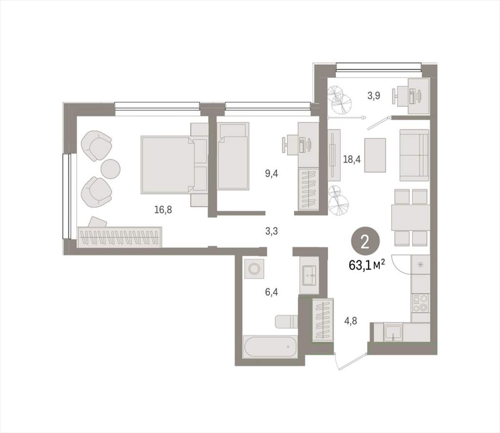 общая 63,07 м2, жилая 26,19 м2, кухни 18,44 м2 |
