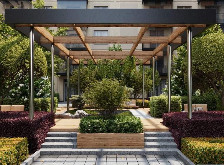 Проект находится в оживлённой части города, поэтому было важно создать приватность - двор поднят на уровень второго этажа и выдержан в стиле японского минимализма: здесь появятся пергола, опоры которой напоминают тории - п-образные ворота синтоистского храма. Под ней - лаунжи с мягкой уличной мебелью и миниатюрный пруд. Находясь в центре мегаполиса жители смогут почувствовать себя на природе.