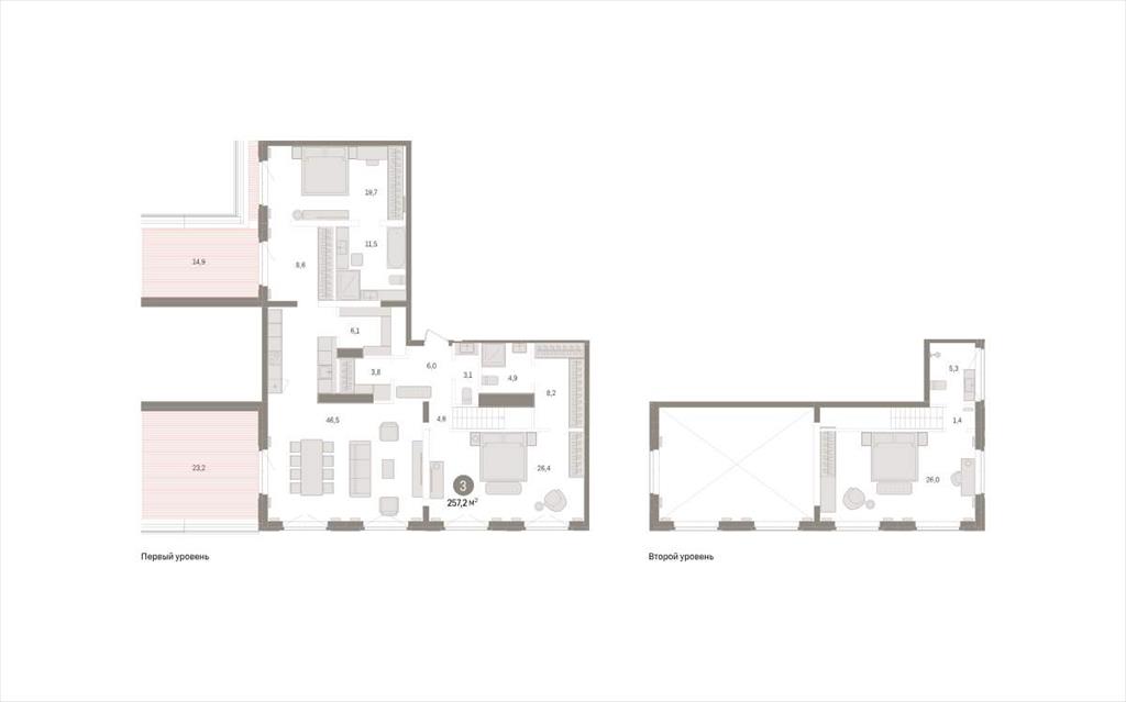 Двухуровневая квартира с кухней-гостиной и тремя спальнями в кварталах «На Минской». Особенности планировки: второй санузел, гардеробная, окно в санузле, двухуровневая, разнесённые спальни, предчистовая отделка, мастер-спальня, постирочная, терраса на крыше.