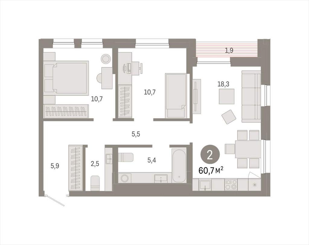 | Квартира с кухней-гостиной и двумя спальнями в жилом районе «Республики 205». Особенности планировки: второй санузел, тёплая лоджия, предчистовая отделка.