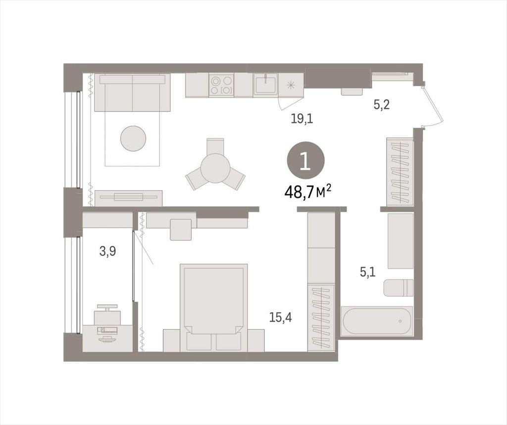 общая 48,68 м2, жилая 15,35 м2, кухни 19,05 м2 |