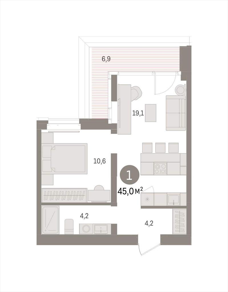 | Квартира с кухней-гостиной и одной спальней в кварталах «На Минской». Особенности планировки: панорамное остекление, лоджия, предчистовая отделка.