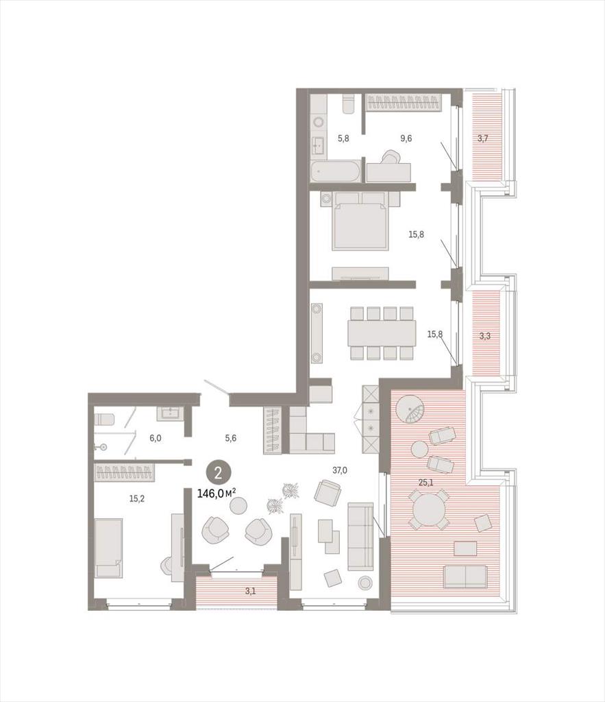 общая 146,03 м2, жилая 30,97 м2, кухни 52,82 м2 |