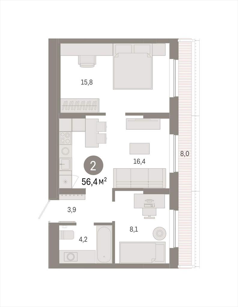| Квартира с кухней-гостиной и двумя спальнями в Октябрьском на Туре. Особенности планировки: разнесённые спальни, предчистовая отделка, терраса на крыше.