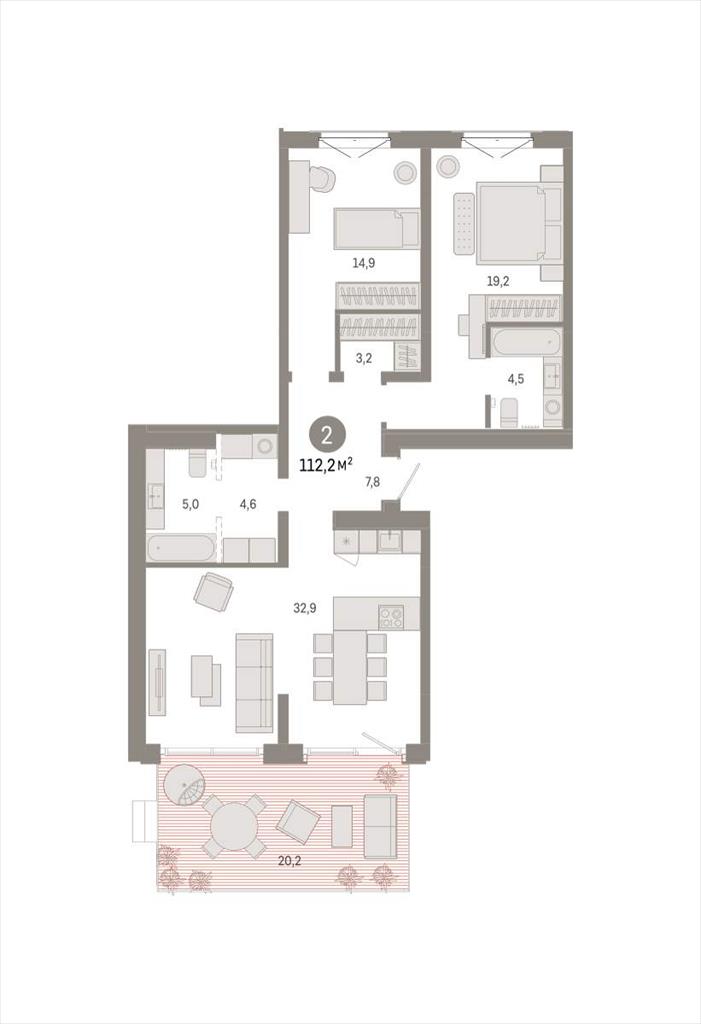 Квартира с кухней-гостиной и двумя спальнями в кварталах «На Минской». Особенности планировки: вид во двор, предчистовая отделка, мастер-спальня, терраса, постирочная.