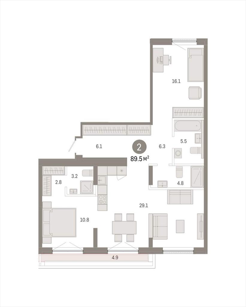 | Квартира с кухней-гостиной и двумя спальнями в Октябрьском на Туре. Особенности планировки: гардеробная, вид во двор, свободная планировка, разнесённые спальни, мастер-спальня, терраса на крыше.