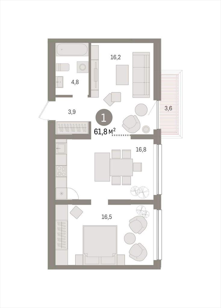 | Квартира с кухней-гостиной и одной спальней в жилом районе «Зарека». Особенности планировки: вид во двор, предчистовая отделка, балкон.