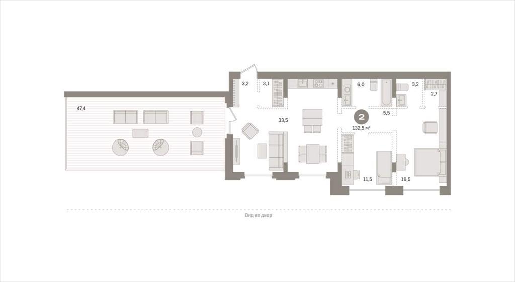 | Квартира с кухней-гостиной и двумя спальнями в жилом районе «Речной порт». Особенности планировки: вид во двор, свободная планировка, терраса на крыше.