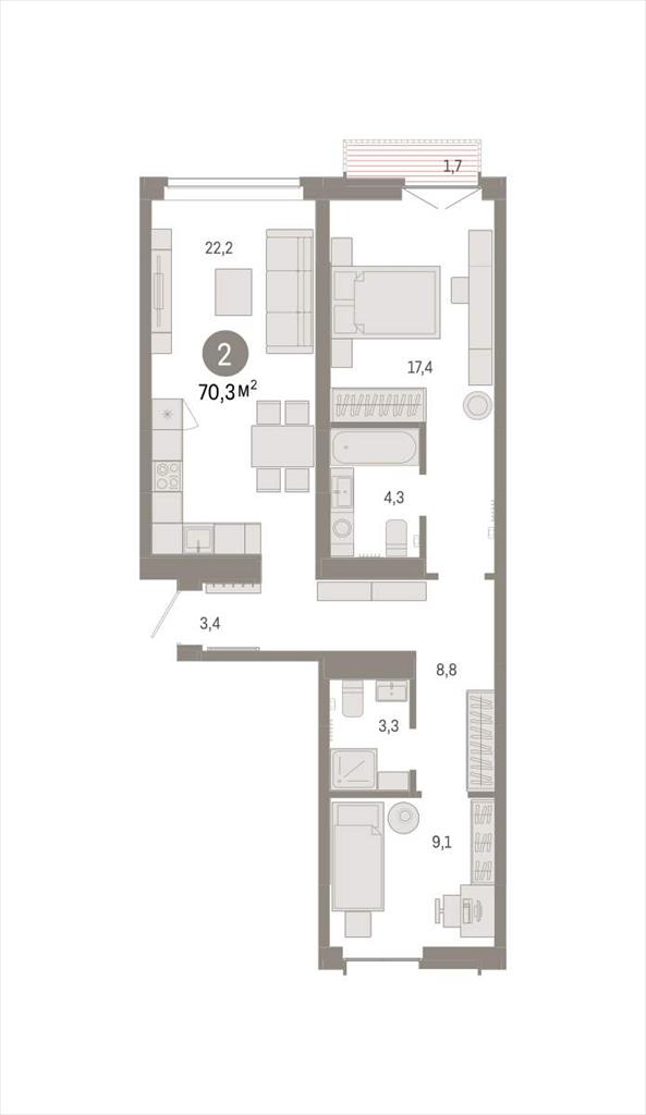 Квартира с кухней-гостиной и двумя спальнями в жилом районе «Республики 205». Особенности планировки: вид во двор, разнесённые спальни, предчистовая отделка, мастер-спальня, балкон.