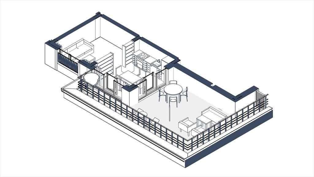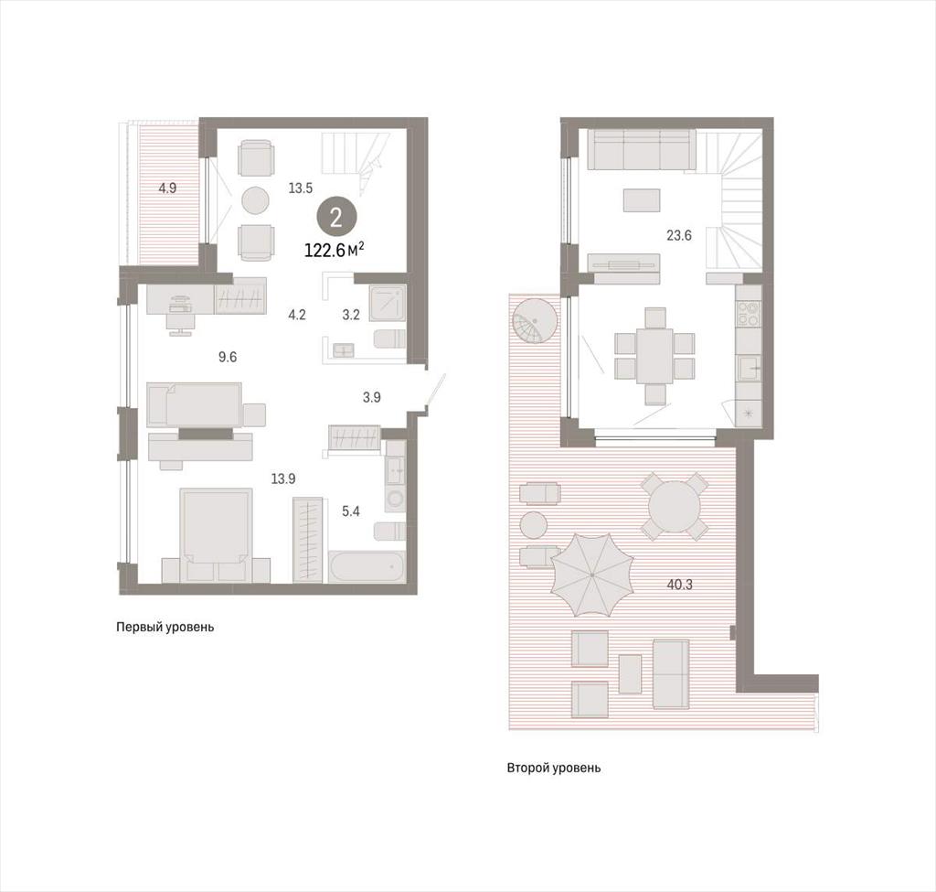| Двухуровневая квартира с кухней-гостиной и двумя спальнями в Октябрьском на Туре. Особенности планировки: второй санузел, двухуровневая, свободная планировка, мастер-спальня, терраса на крыше.