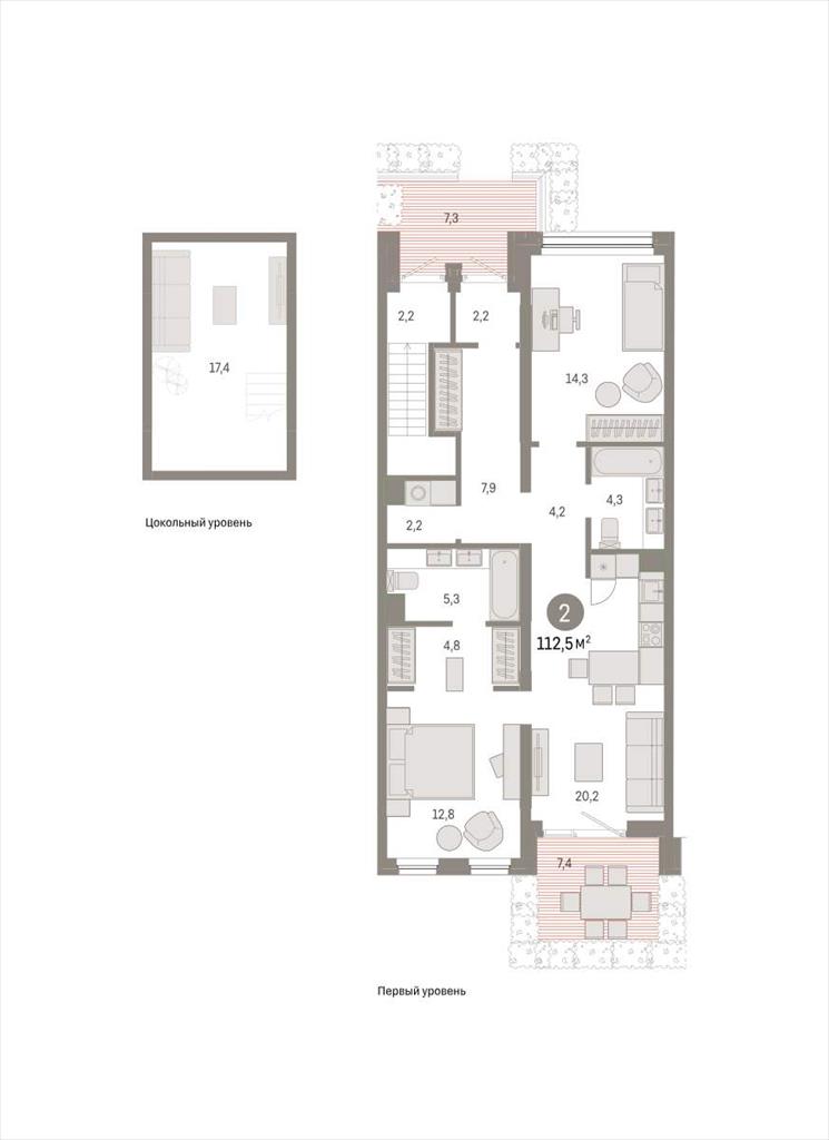 | Квартира с кухней-гостиной и двумя спальнями в жилом районе «Зарека». Особенности планировки: вид во двор, отдельный вход, панорамное остекление, разнесённые спальни, предчистовая отделка, мастер-спальня, терраса, постирочная, терраса на крыше.