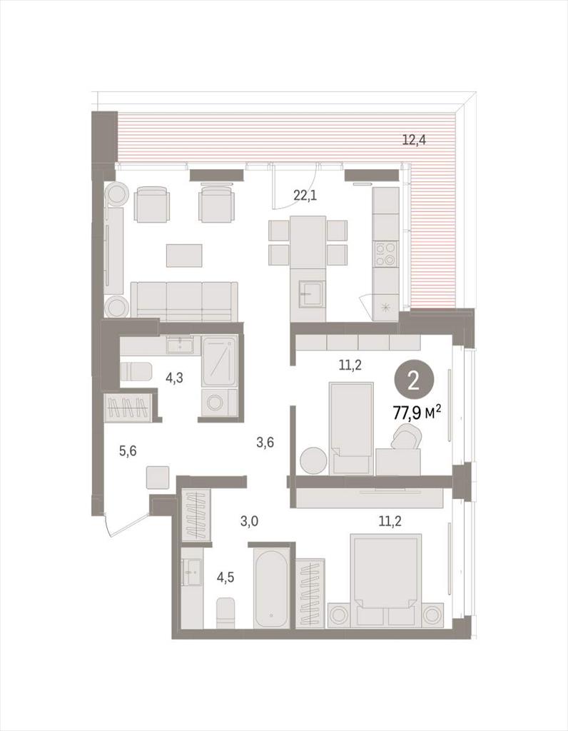Квартира с кухней-гостиной и двумя спальнями в кварталах «На Минской». Особенности планировки: гардеробная, панорамное остекление, лоджия, предчистовая отделка, мастер-спальня.