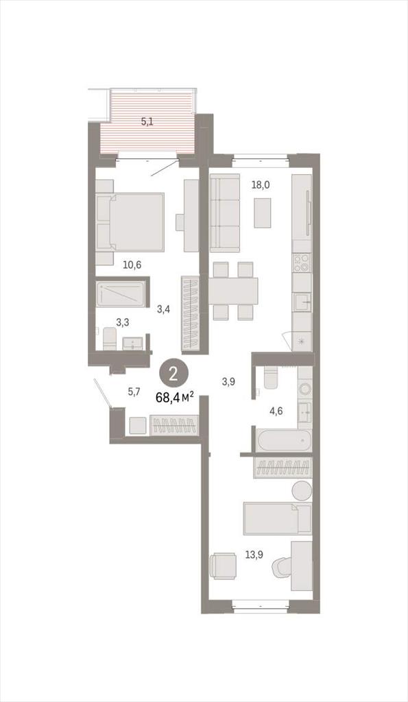 Квартира с кухней-гостиной и двумя спальнями в кварталах «На Минской». Особенности планировки: окна на две стороны, гардеробная, вид во двор, разнесённые спальни, предчистовая отделка, мастер-спальня, балкон.
