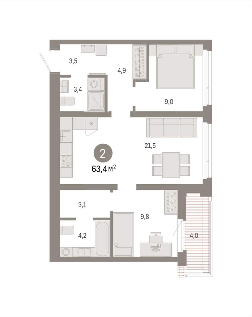 Двухкомнатная квартира 63,41 м2 по ул. Республики 203к1 за 9830000 руб. |