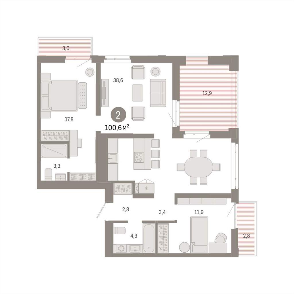 Двухкомнатная квартира 100,59 м2 по ул. Республики 203к1 за 12120000 руб. |
