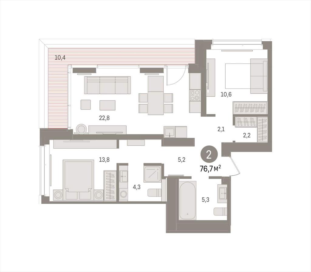 Квартира с кухней-гостиной и двумя спальнями в кварталах «На Минской». Особенности планировки: гардеробная, панорамное остекление, лоджия, разнесённые спальни, предчистовая отделка, мастер-спальня.