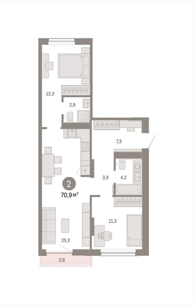 | Квартира с кухней-гостиной и двумя спальнями в Октябрьском на Туре. Особенности планировки: вид во двор, разнесённые спальни, предчистовая отделка, мастер-спальня, балкон.