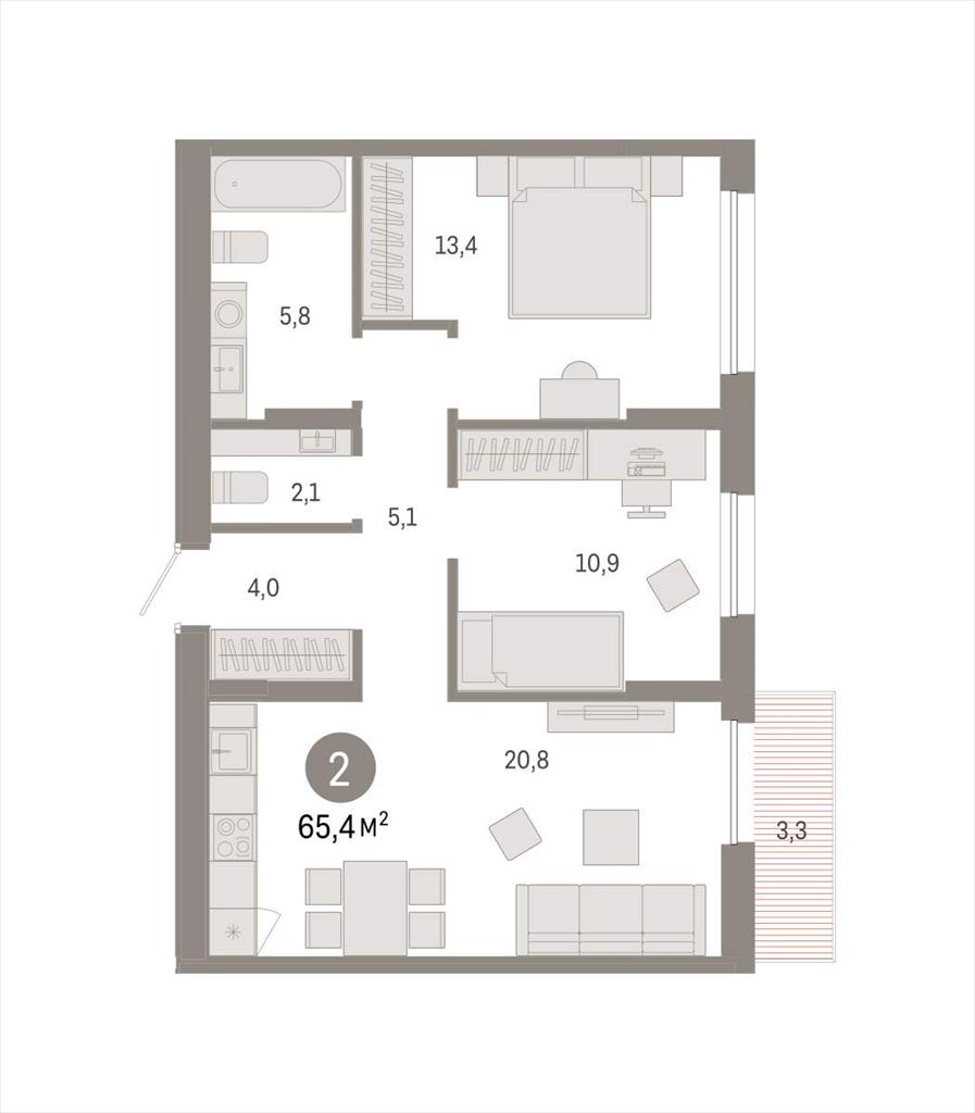 | Квартира с кухней-гостиной и двумя спальнями в жилом районе «Республики 205». Особенности планировки: второй санузел, вид во двор, предчистовая отделка, балкон.