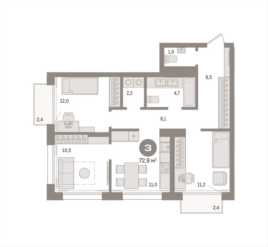 | Квартира с кухней-гостиной и двумя спальнями в Октябрьском на Туре. Особенности планировки: второй санузел, предчистовая отделка, балкон.