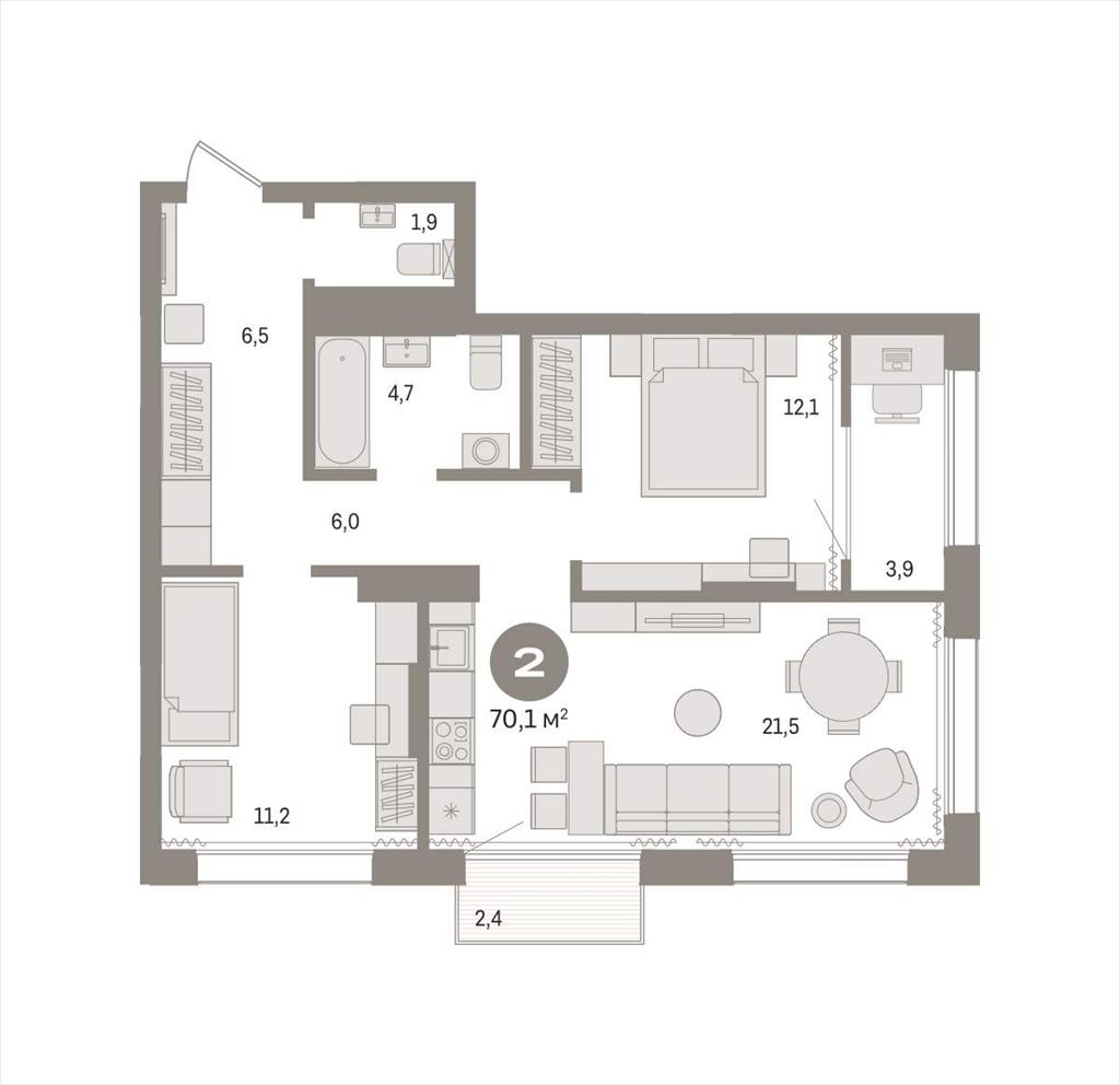 общая 70,09 м2, жилая 23,28 м2, кухни 21,48 м2 |