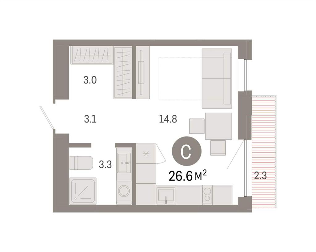 | Студия в Октябрьском на Туре. Особенности планировки: гардеробная, вид во двор, предчистовая отделка, балкон.
