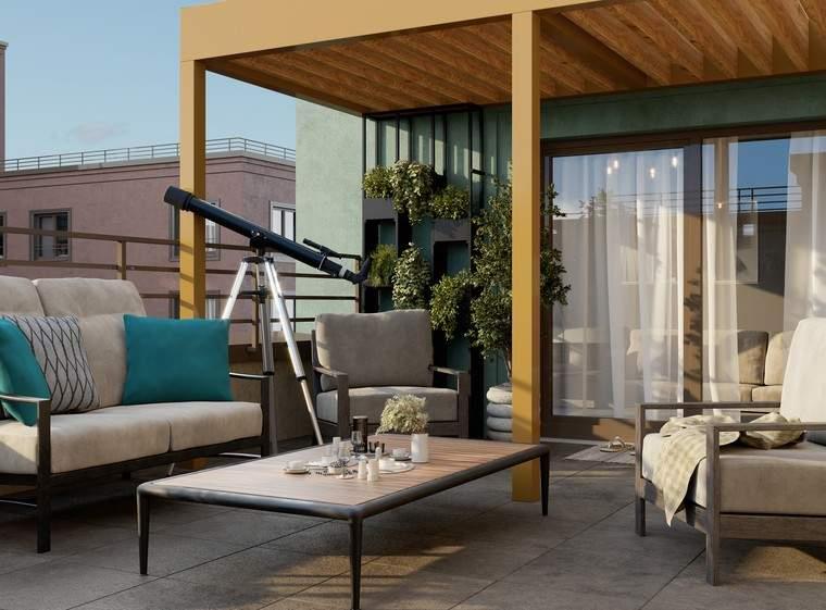 Проект находится в оживлённой части города, поэтому было важно создать приватность - двор поднят на уровень второго этажа и выдержан в стиле японского минимализма: здесь появятся пергола, опоры которой напоминают тории - п-образные ворота синтоистского храма. Под ней - лаунжи с мягкой уличной мебелью и миниатюрный пруд. Находясь в центре мегаполиса жители смогут почувствовать себя на природе.
