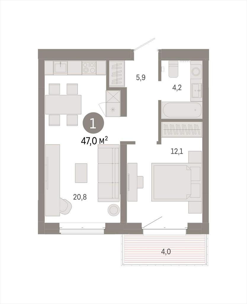 Квартира с кухней-гостиной и одной спальней в кварталах «На Минской». Особенности планировки: предчистовая отделка, балкон.