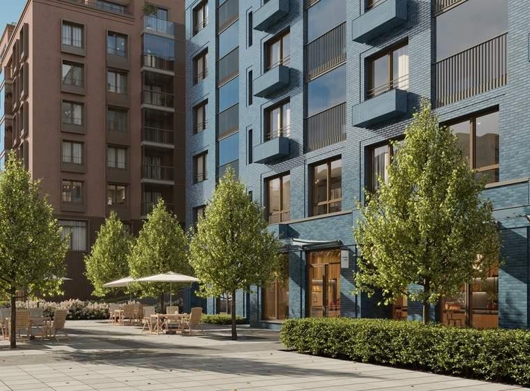 Дворы располагаются на стилобатах и имеют приватный характер с уклоном на тихий и спокойный отдых. Каждый из дворов отличается по функциональному наполнению и дизайну. Тут есть детские площадки, сенсорные сады, лаунж-зоны, функциональные газоны и зоны воркаута. Все оборудование выполнено из натурального дерева: оно вписывается в общий облик, не нагревается летом и не промерзает зимой.