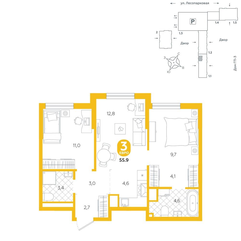 Квартира располагается в ГК «Чистые Пруды» от «Паритет девелопмент». Это флагманский проект компании в Тюмени. <br>Расположение вдали от шумных улиц и оживленного центра создает ощущение жизни на природе и окружает тишиной и спокойствием. Есть вся необходимая социальная и коммерческая инфраструктура: магазины и сфера услуг на первых этажах. Школы, сады, поликлиника, парки в шаговой доступности.<br>Квартал строится в районе Новой Лесобазы. Рядом выезд на объездную, что существенно экономит время. Поездка до центра города на автомобиле занимает 15-20 минут.<br>Городские кварталы «Чистые Пруды» сформирован из домов переменной этажности и многоуровневых паркингов. Ввод 1 очереди строительства запланирован на II кв. 2028 года. <br>Всё благоустройство квартала представлено двумя функциональными зонами: приватная внутри дворовая и общественная. Каждый закрытый двор имеет выход на единую променадную зону - бульвар.<br>Концепция благоустройства основана на принципе модульности, что формирует основную идею приватности. Приватность проекта подчеркивает его особенный климат внутри. Модульное благоустройство позволит максимально эффективно использовать пространство двора и удовлетворить потребности различных категорий жителей.<br>В квартирах базово выполнена улучшенная черновая отделка, которая включает в себя: выровненные стены, стяжка пола с шумоизоляцией, горизонтальная разводка отопления, установлены счетчики с телеметрией, окна с 5-камерным профилем и надежные входные двери.<br>При желании можно добавить ремонт от застройщика и включить его в стоимость ипотеки, что позволит сэкономить на стройматериалах и переехать сразу после получения ключей. <br>Характеристики квартиры:<br>этаж - 1<br>количество комнат - 3<br>номер помещения - 2<br>площадь квартиры - 55,9 кв.мГармоничные пропорции и большие окна наполняют пространство светом, создавая уютную атмосферу. Умное зонирование позволяет удобно организовать как рабочую, так и жилую зоны, что особенно важно для современных жителей. Санузел спроектирован с учетом всех потребностей: здесь есть ванна и место для стиральной машины. Каждый метр квартиры используется с максимальной эффективностью, что делает эту планировку отличным выбором для тех, кто ценит комфорт и удобство. |